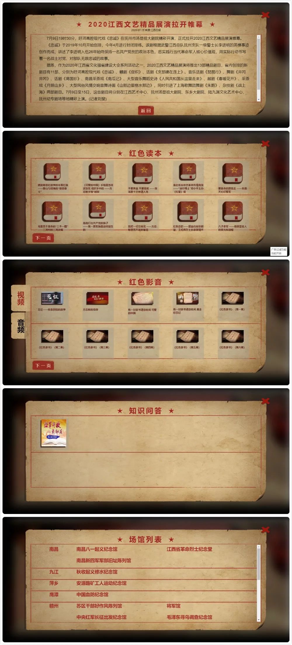 点进地图上的小红旗,就能进入各地市的场馆中,通过全景图与各展厅图片,队员们可以足不出户地参观11个爱国主义展馆。大家跟随镜头了解各个时期的革命活动。
