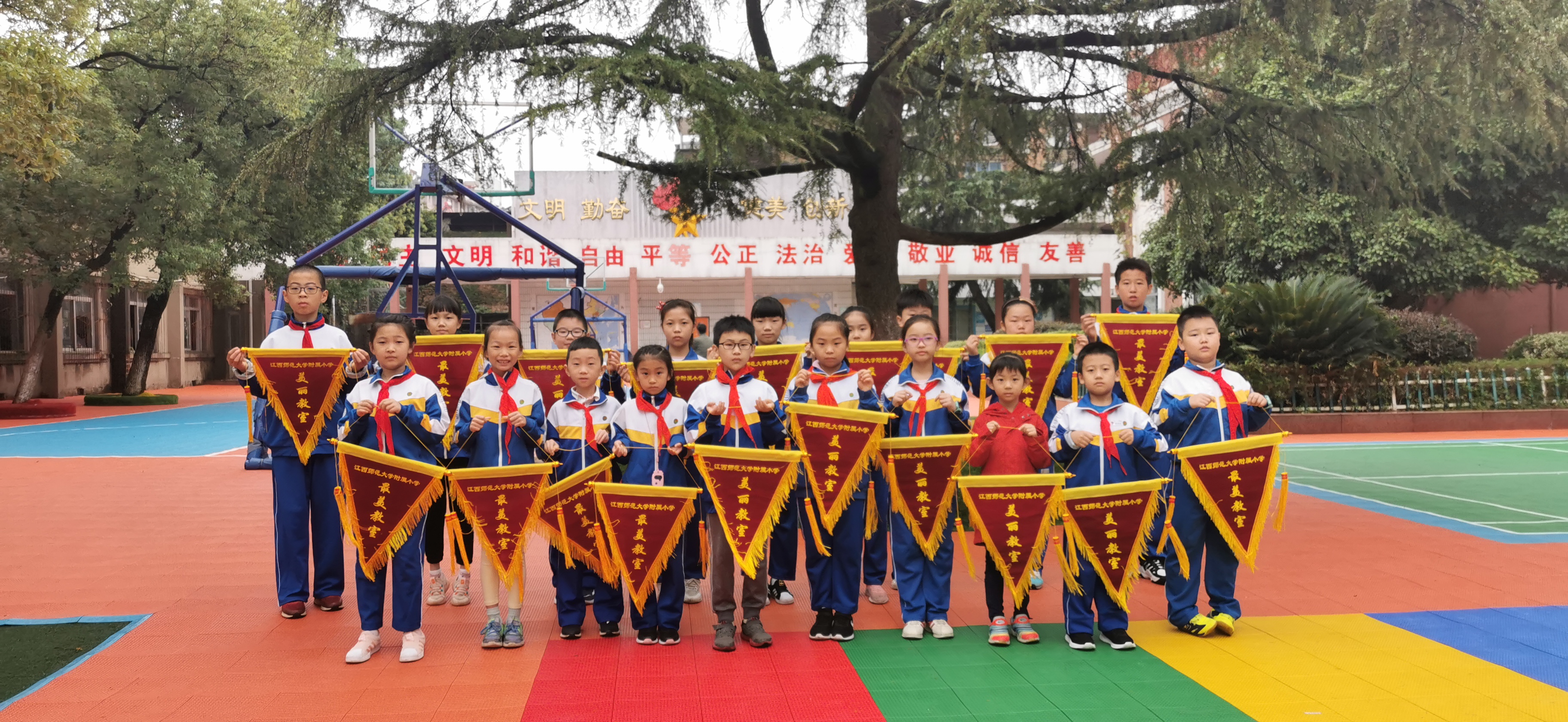 9月11日,由附小校领导班子、德育处、大队部和各年级家委代表11人组成评审团,分别对全校38个教室的环境卫生、常规布置内容、文化建设等方面进行评比。