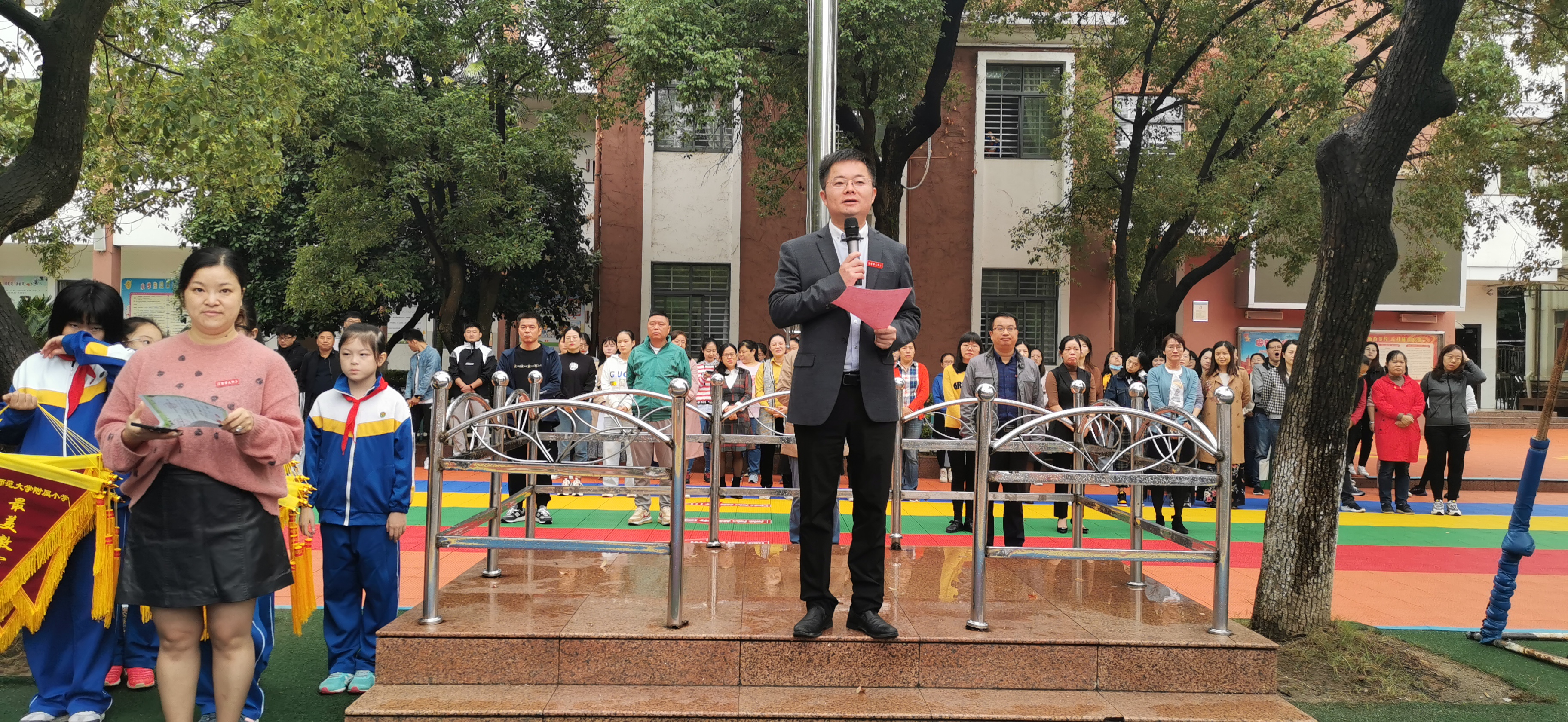 甘党根书记和邓信哲副校长为获称号的班级授旗。