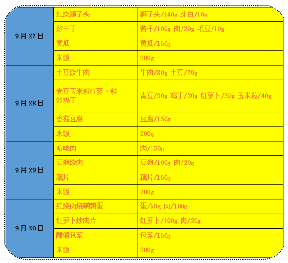 师大附小9月27日-9月30日食谱