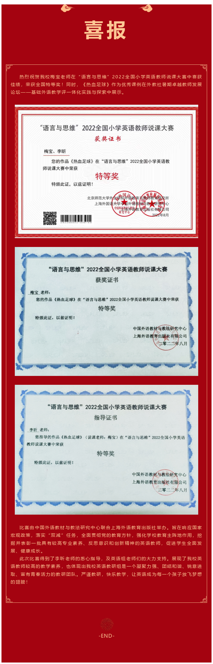 喜报 | 热烈祝贺色情直播 梅宝老师荣获2022年全国小学英语教师说课大赛特等奖