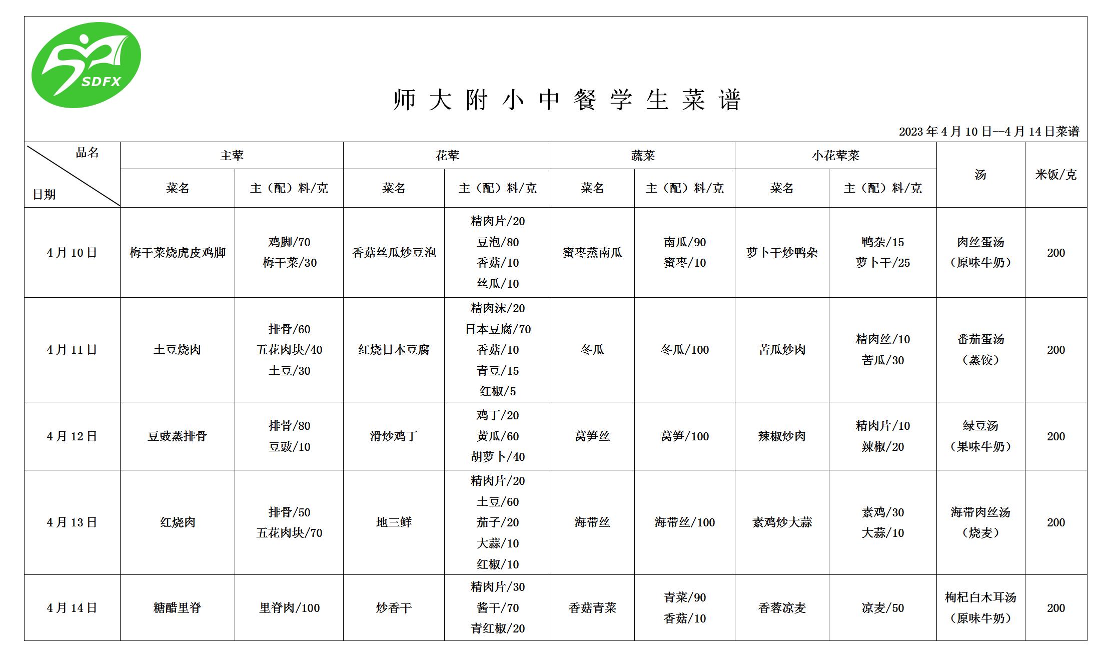 师大附小2023年4月10日-4月14日食谱