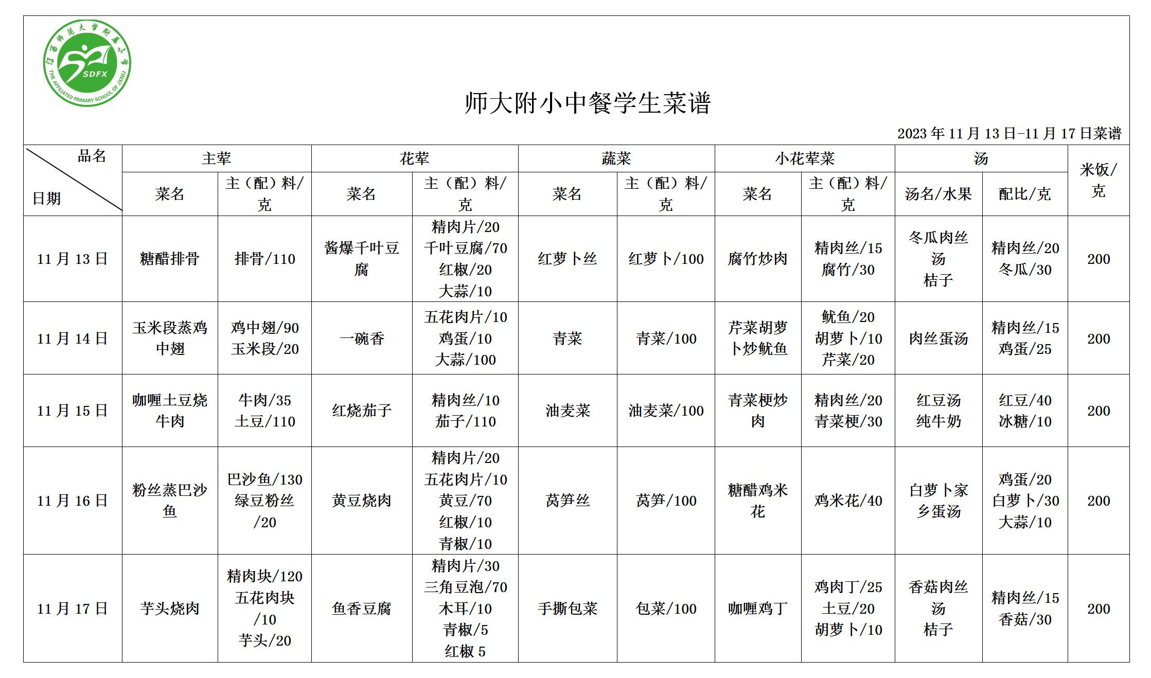 师大附小2023年11月13日-11月17日食谱