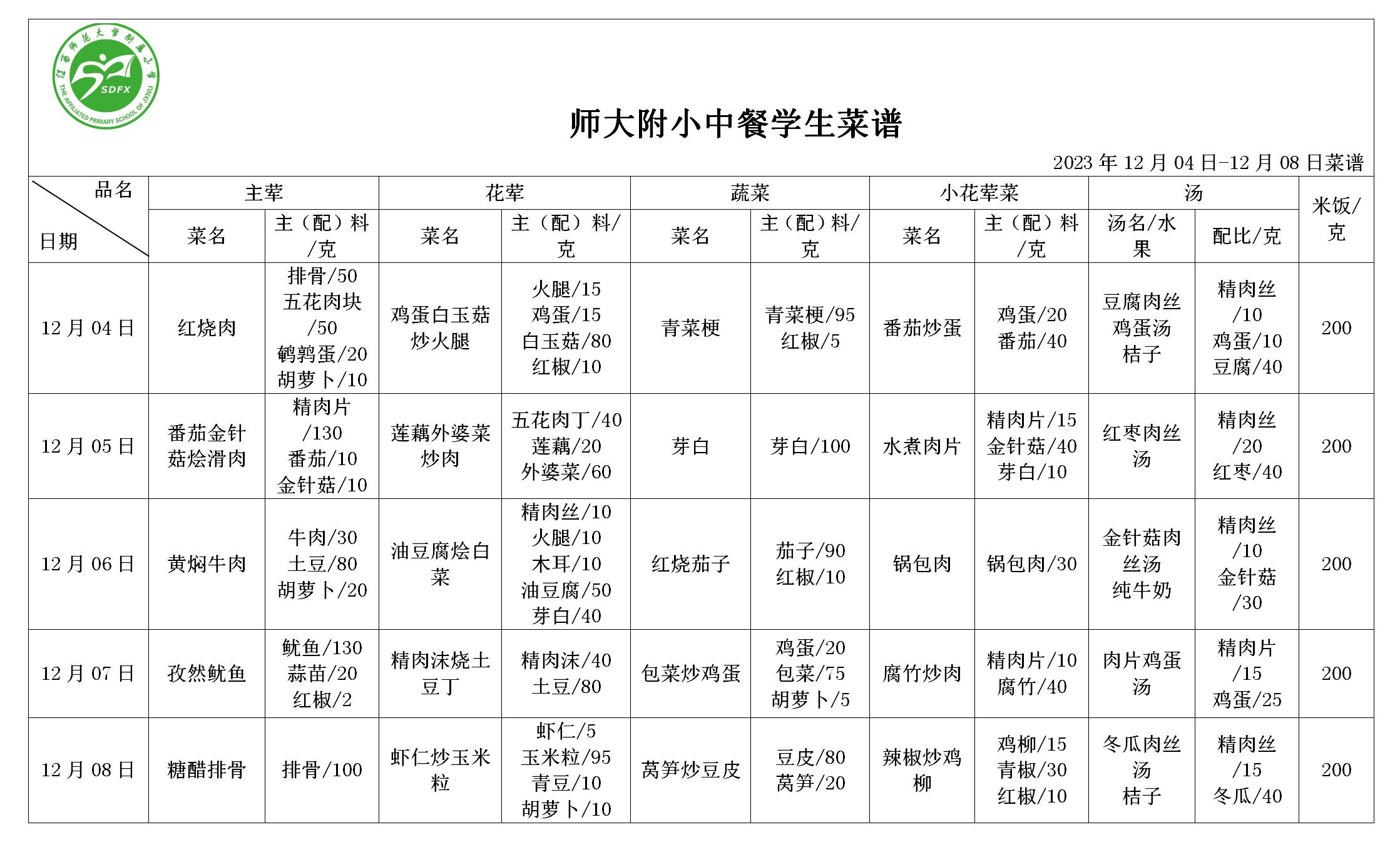 师大附小2023年12月4日-12月8日食谱