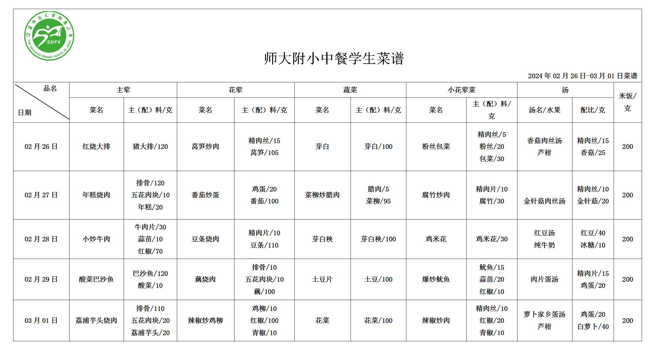 师大附小2024年2月26日-3月1日食谱