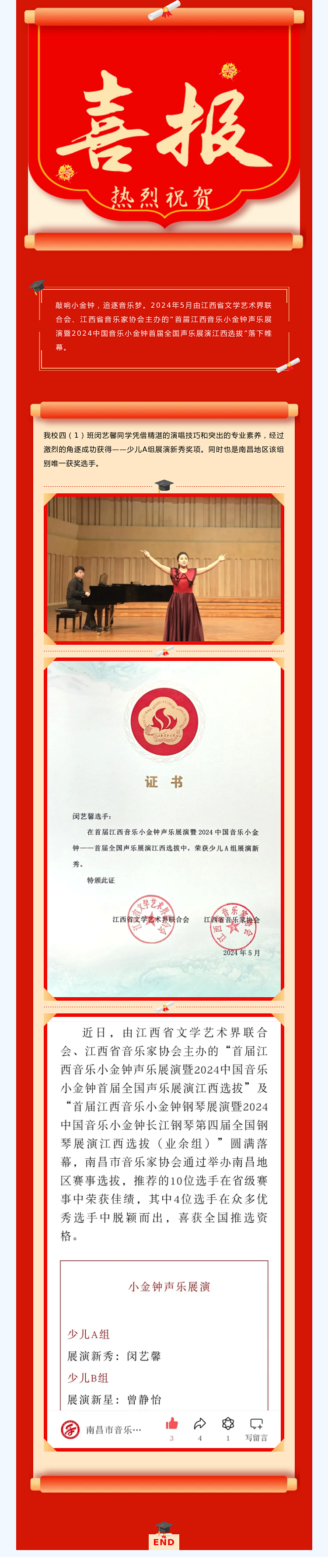 喜报|热烈祝贺色情直播 闵艺馨同学在2024中国音乐小金钟首届全国声乐展演江西选拔赛中喜获佳绩