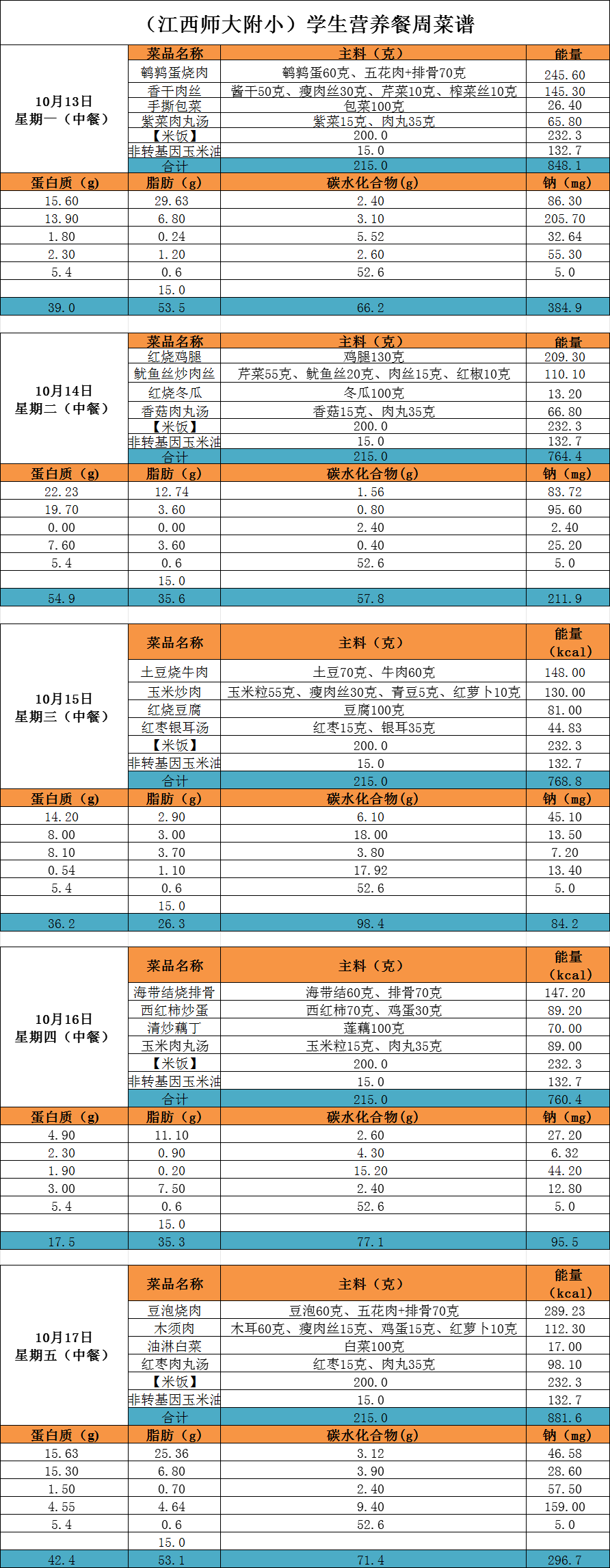 师大附小2025年10月13日-2025年10月17日食谱