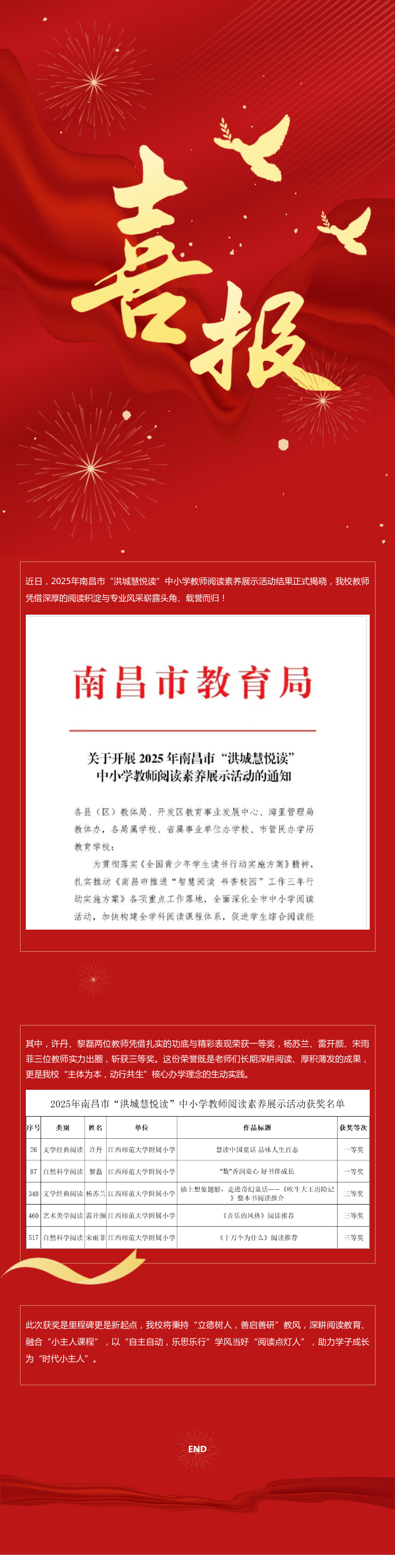 喜报∣色情直播 教师在南昌市中小学教师阅读素养展示活动中斩获佳绩